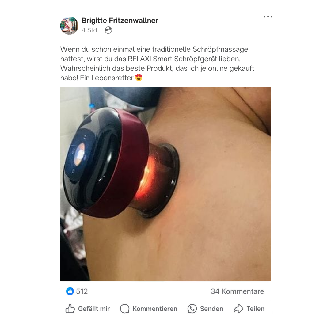 Verbessere dein Schröpferlebnis! Nutzer, die traditionelle Schröpfmassagen kennen, schwärmen von unserem RELAXI Smart Schröpfgerät. Entdecke das beste Online-Schnäppchen deines Lebens – ein echter Lebensretter!
