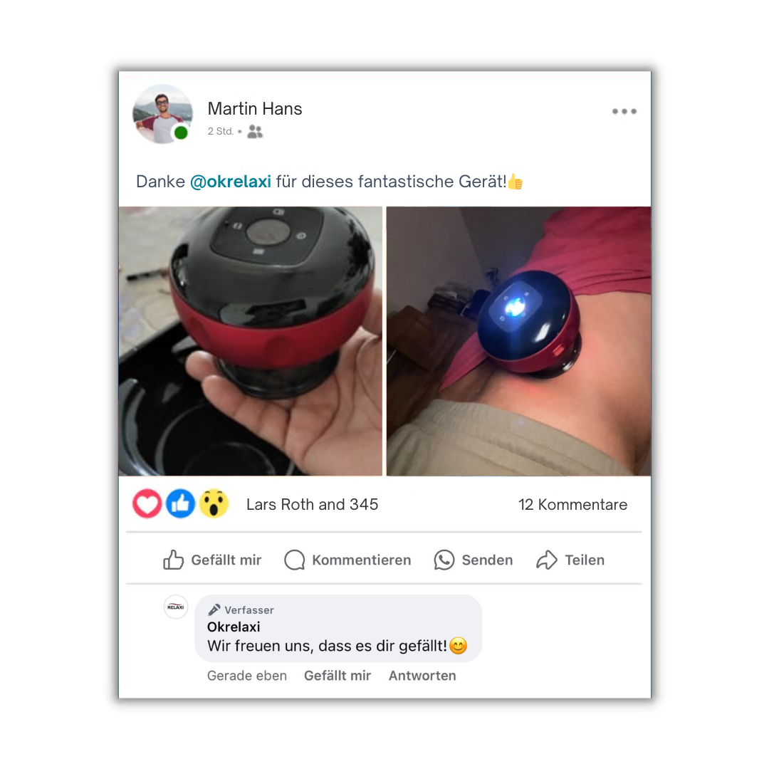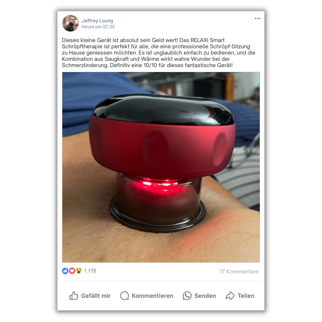 Sieh, warum Nutzer RELAXI Schröpftherapie mit 10/10 bewerten! Tauche in die Bewertungen ein und entdecke, warum dieses kleine Gerät ein absolutes Must-have für schmerzlindernde Anwendungen zu Hause ist. Dein Weg in ein schmerzfreies Leben beginnt hier.