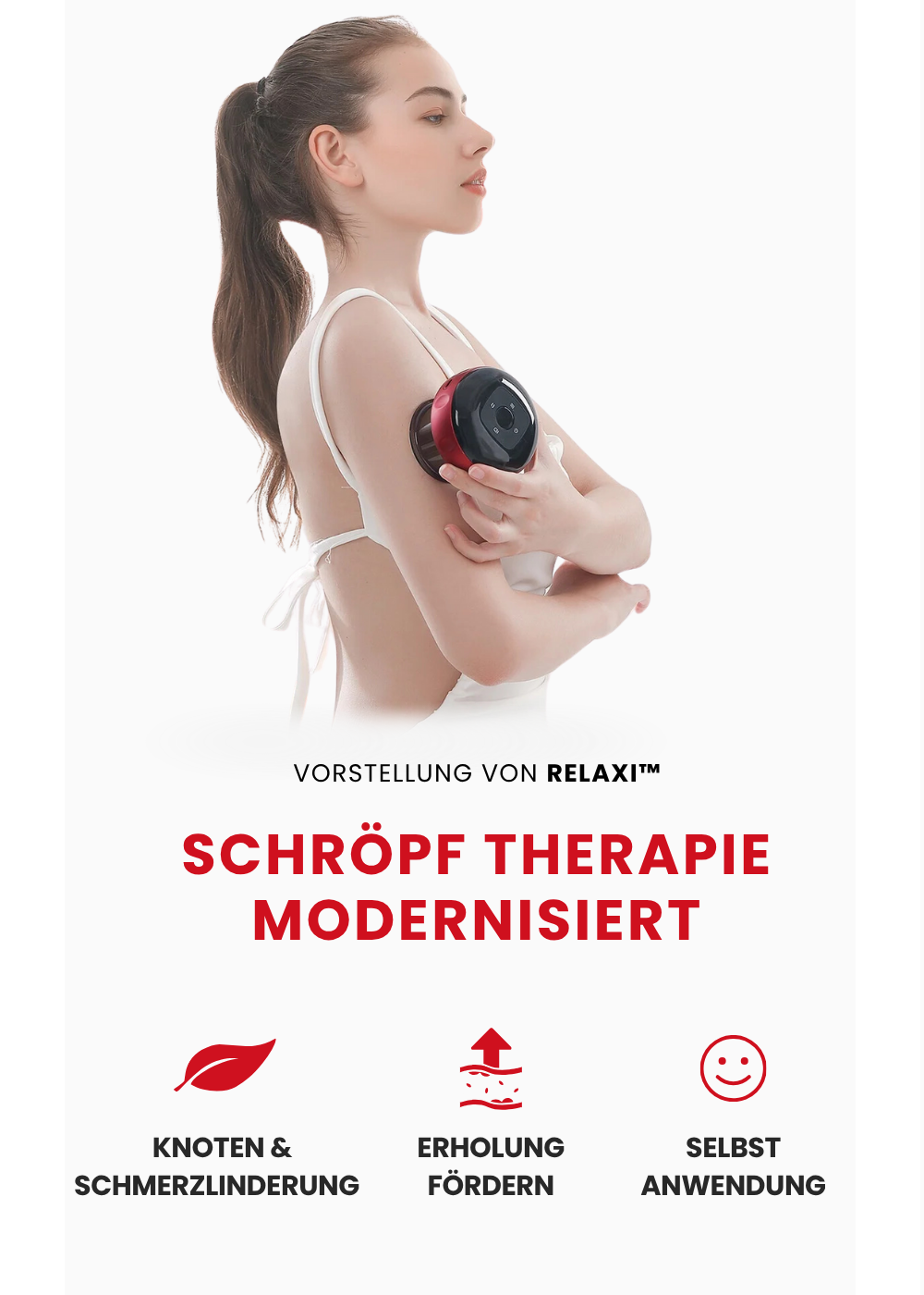 Suchst du nach einer Möglichkeit, Körperschmerzen, Verspannungen und Müdigkeit auf bequeme, einfache und schnelle Weise zu lindern? Das Smart RELAXI™ ist ein multifunktionales dynamisches Schröpfmassagegerät, das dynamische Saugkraft mit Rotlichttherapie kombiniert.