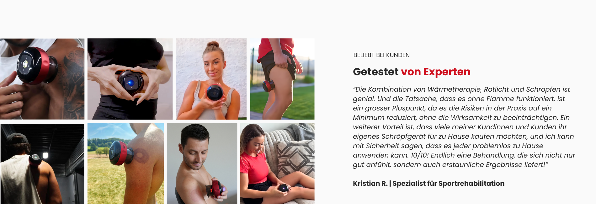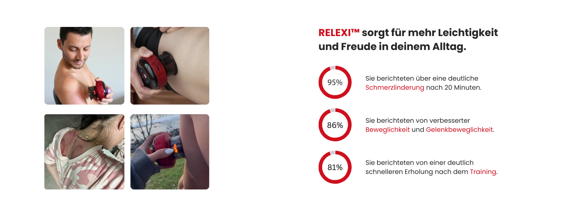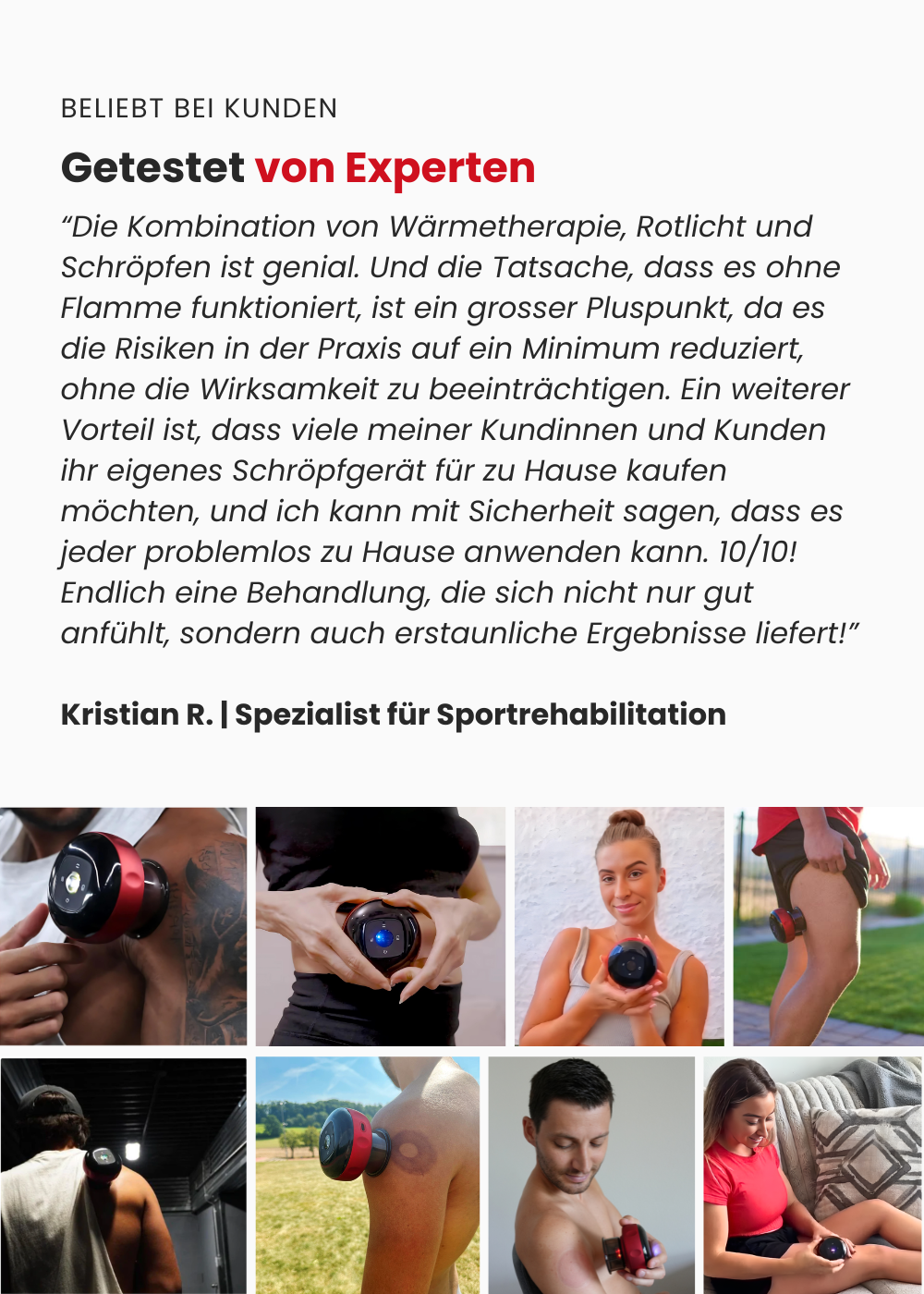 In den letzten 8 Jahren haben Studien gezeigt, dass elektrische Schröpfmassagegerät die Muskelaktivität verringern, Schmerzen lindern, Entzündungen reduzieren und die Genesung beschleunigen. Das RELAXI™ Smart Schröpfmassagegerät hat in Verbrauchertests sogar noch bessere Ergebnisse erzielt.